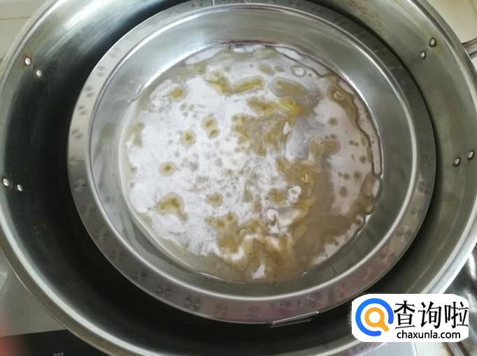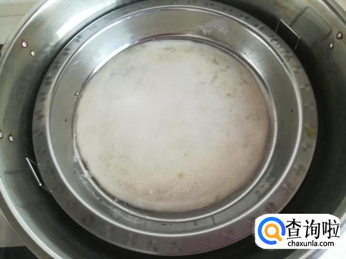把粉盘放开水锅里加热后拿出来,给粉盘里舀适量粉糊 ,两手转动,把粉糊摊匀,再放会开水锅里,盖上锅盖,隔水蒸煮。
