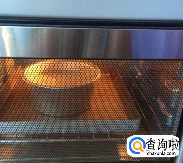 把拌好的面糊倒入六寸阳极活底模中,从高处十厘米左右垂直摔几下震出大汽泡,我摔了大概十几下,哈哈,震平后如果模具边缘有滴落的面糊擦拭干净,否则会影响戚风的爬高。