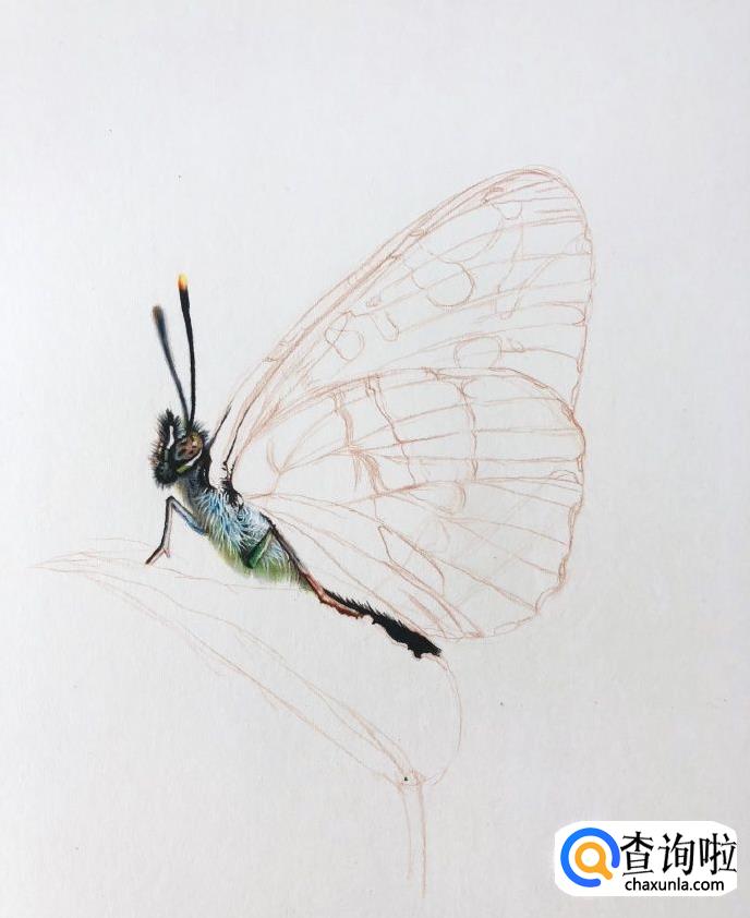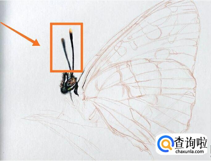 给大家看一个放大版的头部上色方法,这里蝴蝶的两根触须一实一虚,这点要多加注意。