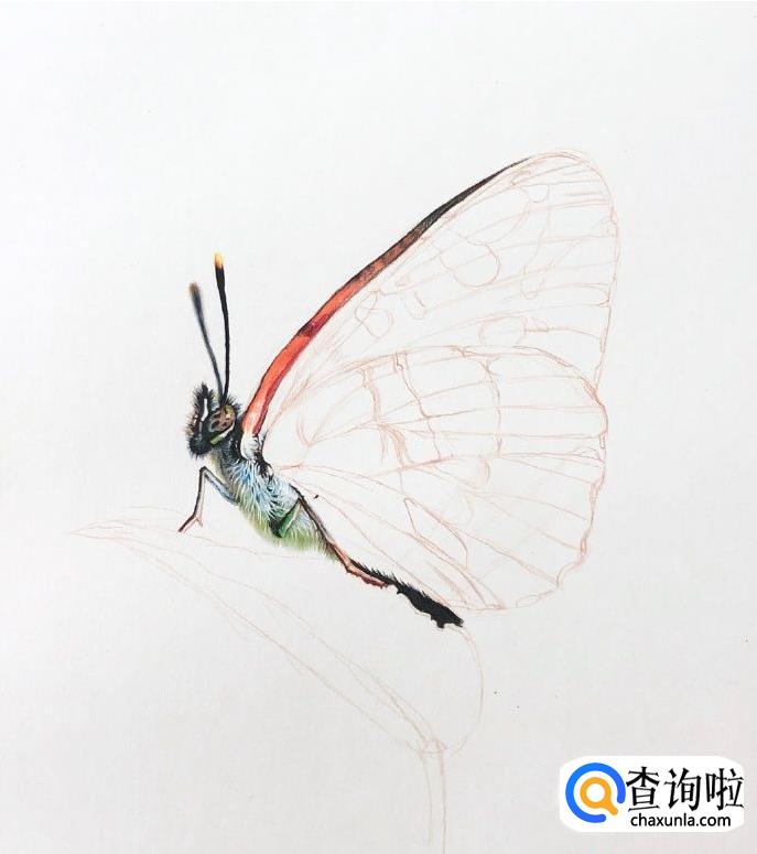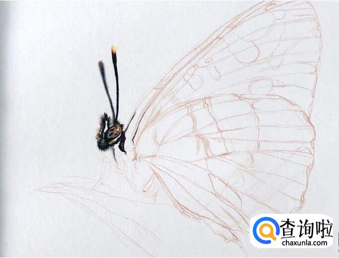 接着开始给蝴蝶上色,先给蝴蝶头部上色,选择颜色较深的彩铅来画,因为有渐变色所以大家在上色的时候也要注意这一点。