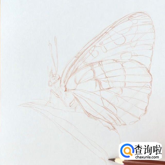 接下来我们用铅笔在纸上定形,蝴蝶最重要的就是翅膀,而翅膀就是用线条组合画成的,我们可以参照下图中的形状画好蝴蝶的线稿。