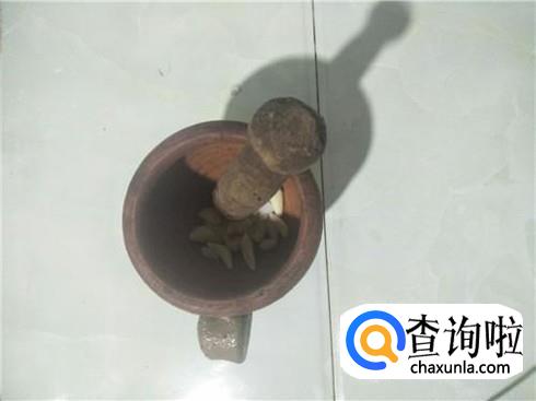 接着再来准备他的调料,先准备少许的蒜蓉,在一次做蒜蓉的过程中,先剥几粒蒜,放进蒜罐里面,然后再加少许的食盐进行捣碎,捣碎之后变成了蒜蓉。