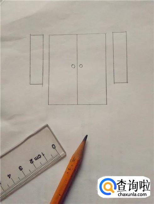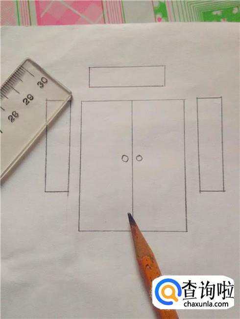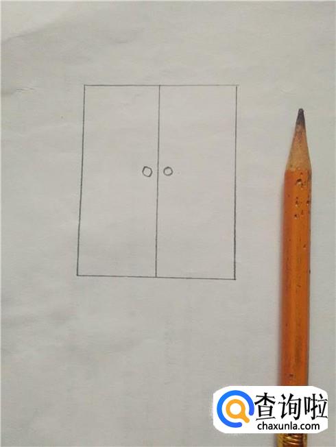 在长方形中间画一条竖线,表示两扇门,在竖线左右各画一个圆圈,表示门环。