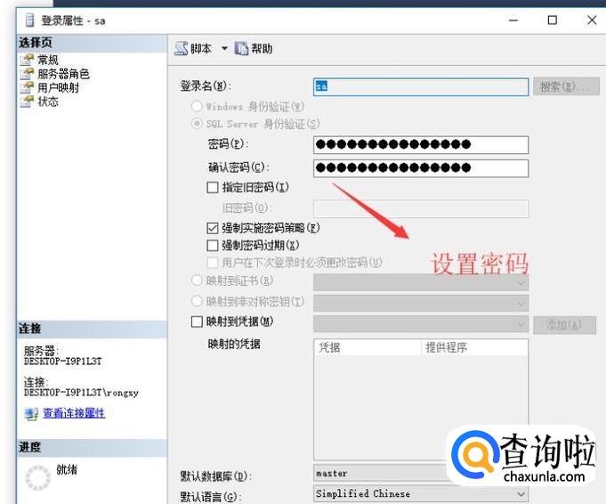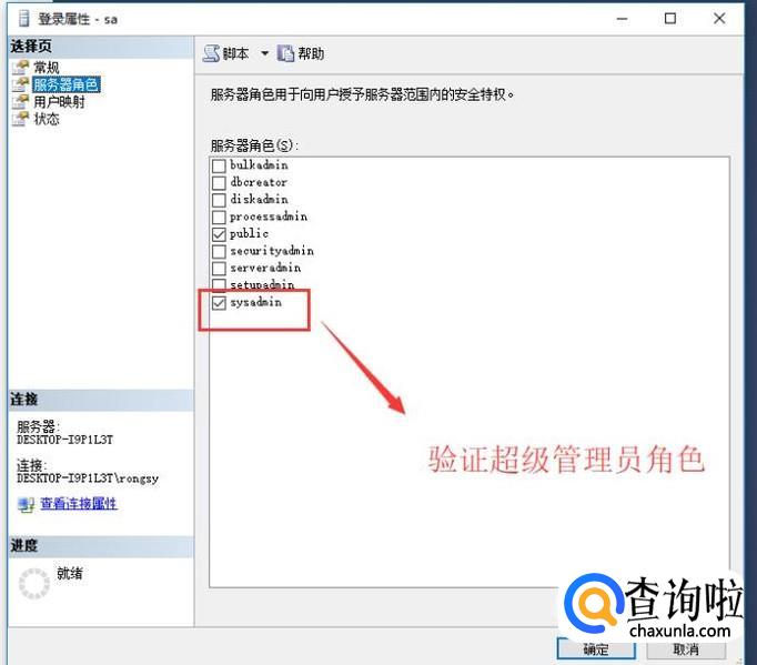 打开属性界面以后先切换到服务器角色选项,验证一下sa是否是管理员角色,如下图所示