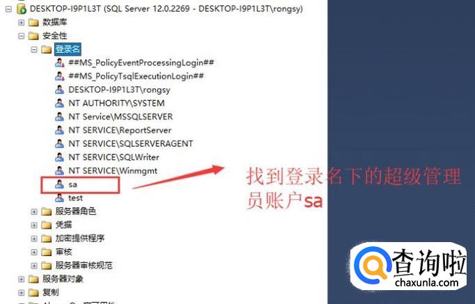 用Windows身份验证方式登录数据库以后打开登录名文件夹,然后找到sa账户,如下图所示
