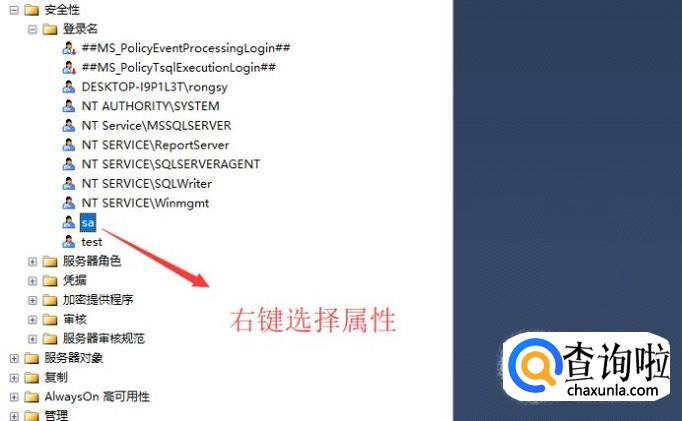 接下来我们右键单击sa账户,选择属性选项,如下图所示,账户的密码设置都在属性界面里