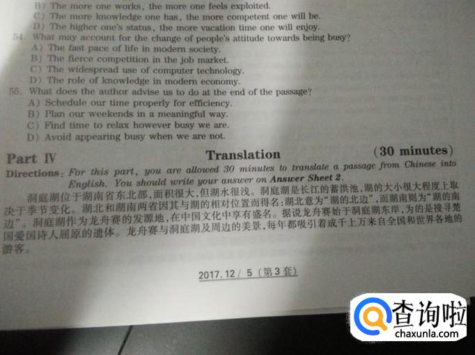 翻译:这个题型我认为还是尽可能去拿分,对于我们这些应试教育培养出来的学生,以前很少接触到这种题型,对于翻译的信雅达真的很难做到,我认为在平时的翻译练习中尽可能的去翻译准确,其次再是语句的漂亮程度,主要时态语态,对比答案的翻译,寻找自己的不足,加以改正。