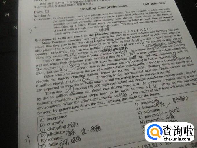 选词填空:这道题有点类似于高中的完形填空题,这道题的考察侧重点在于语法的理解与运用,所以在平时做题的过程中,要多积累语法知识,经验多了,以后做题感觉自然就来了,这就是我们通常说的题感。具体来说,如果碰到某个空很纠结选哪个的时候,不要慌,通读全文,理解全文的大意,再综合去选择。总之,理解第一,细心甄选就好,这一题是一个拿分项。