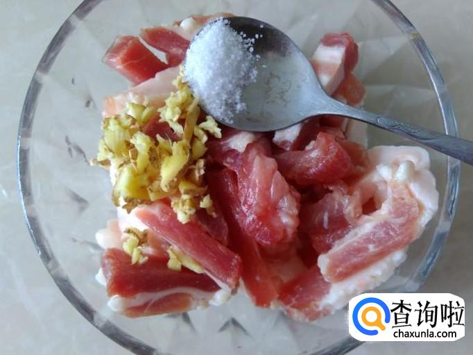 猪肉切成肉丝,加适量的盐、姜蓉、1勺生抽、