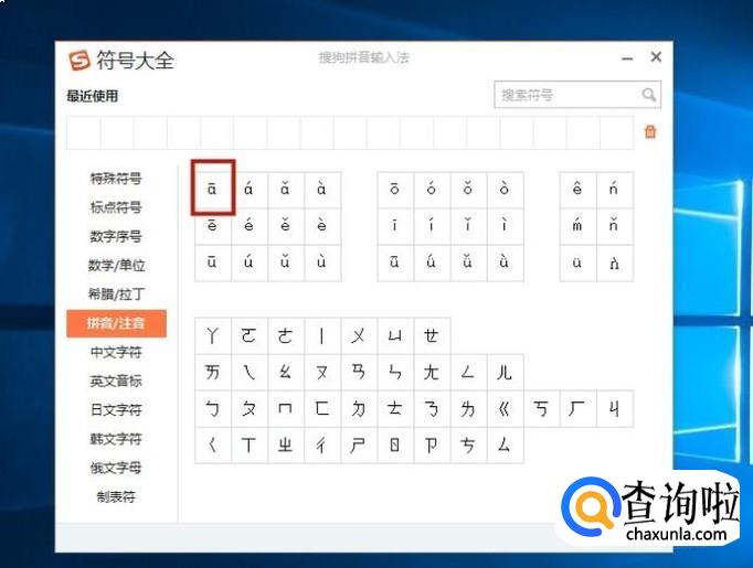 弹出”符号大全“,选择”拼音/注音“,选择一个汉语音标,点击一下。