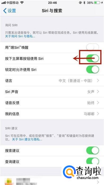 接着点击关闭按下主屏幕按钮使用Siri开关,如下图所示。