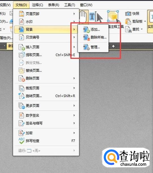 在编辑软件中打开需要添加或者修改的文件,然后选择菜单栏中的文档,文档中就有背景工具,点击背景,在背景工具中有添加,全部删除以及管理,点击添加。