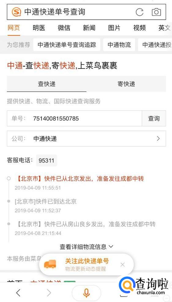 打开浏览器搜索“中通快递单号查询”,在搜索结果首条中,输入快递单号后点击查询即可;也可以通过中通快递官网查询物流信息。