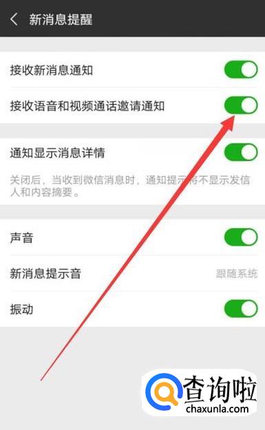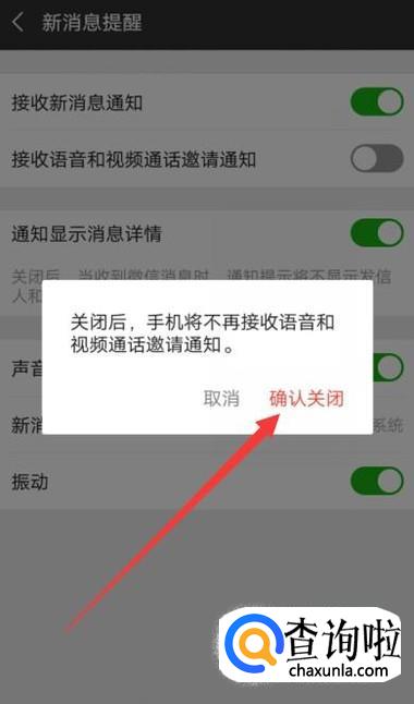 点击开关之后,系统就会提示“关闭后,将不再接受语音和视频通话邀请通知”,系统会自动关闭视频通知和语音通知,我们将无法进行视频聊天。