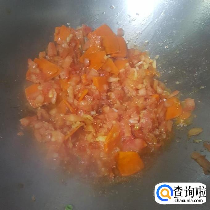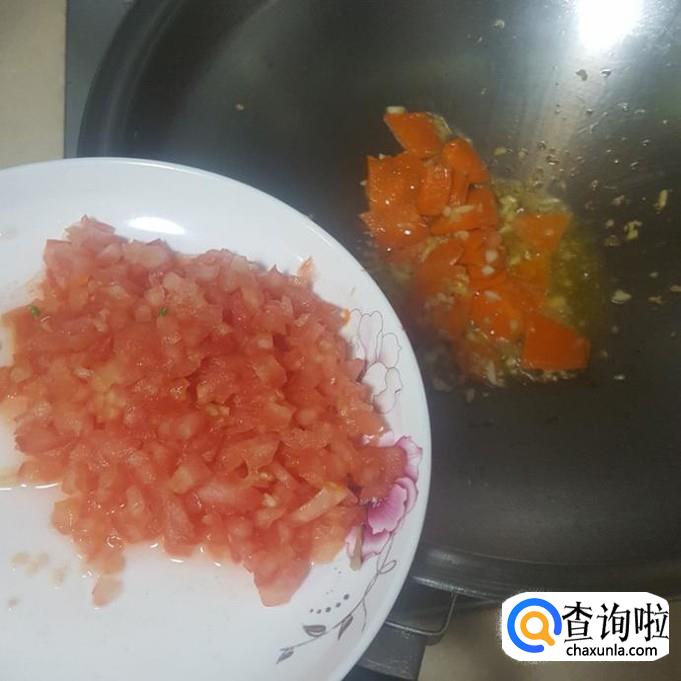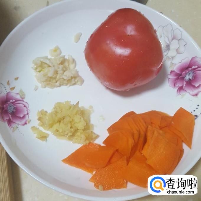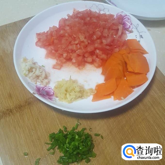 番茄切丁,红萝卜切菱形片,姜蒜切末,葱切细