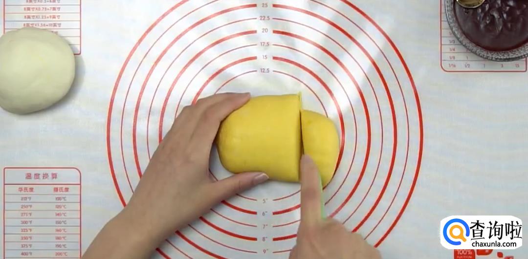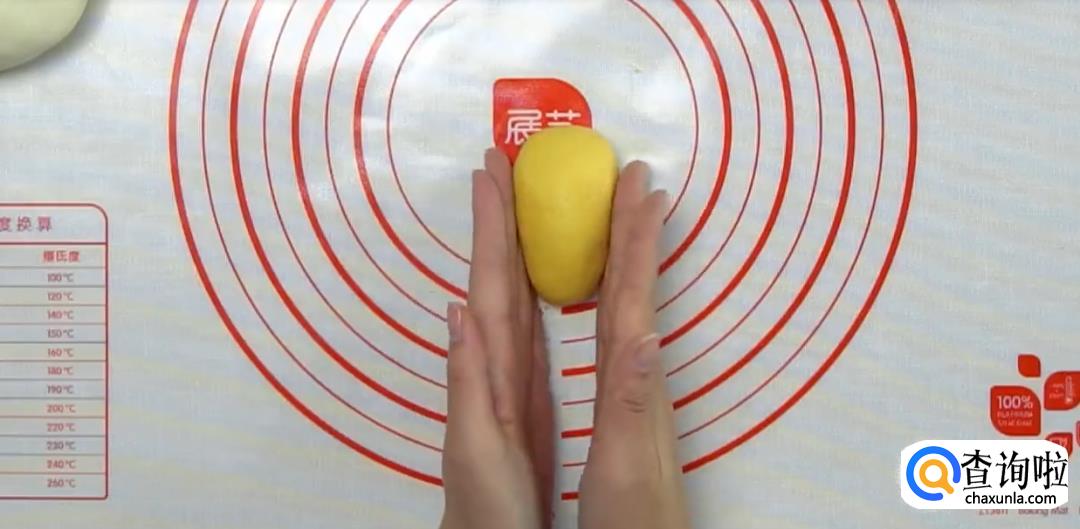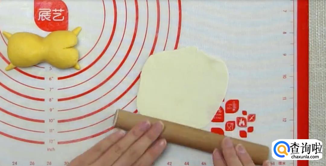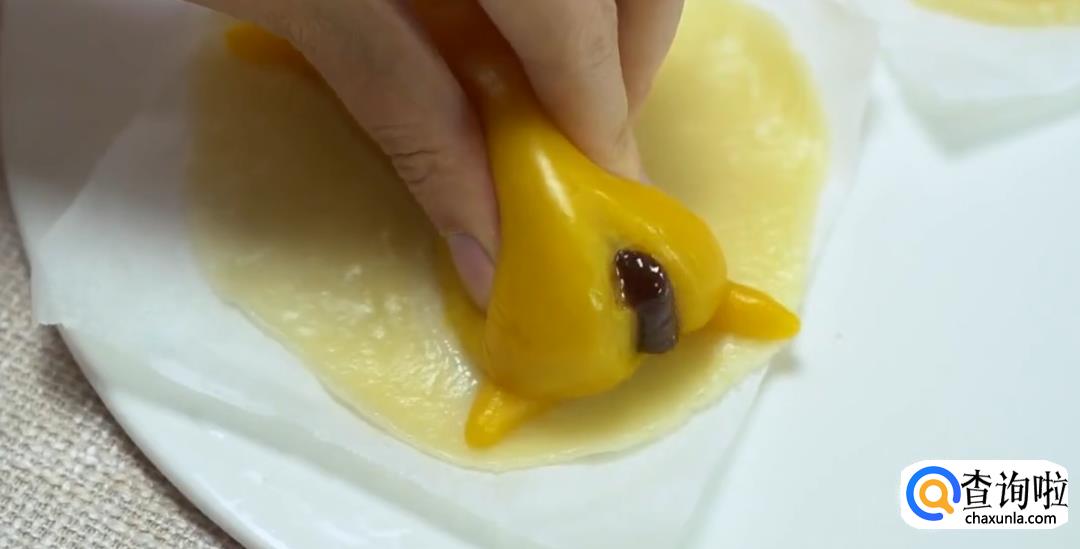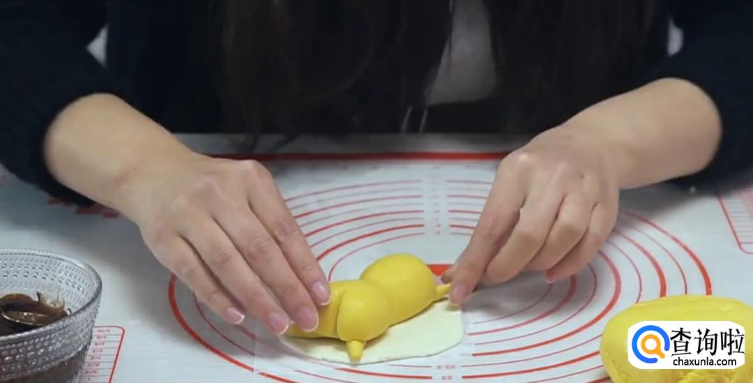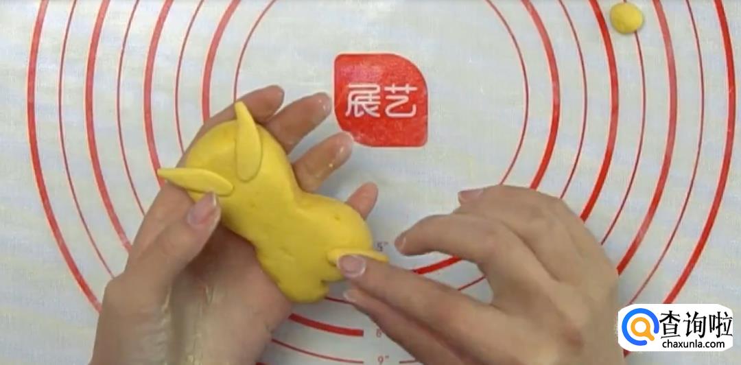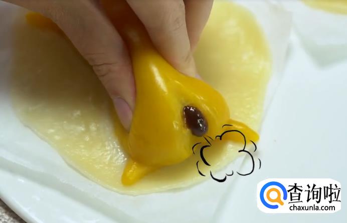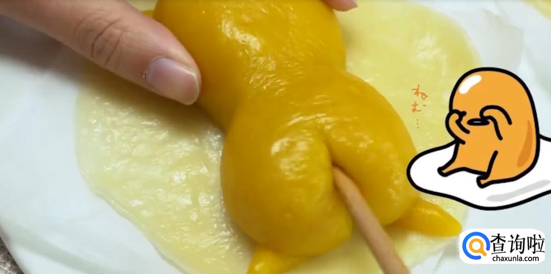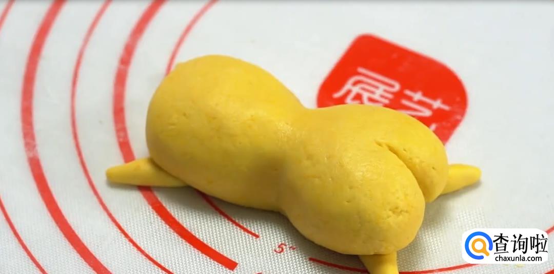 将团子搓成椭圆形,捏出腰身,用刀切出屁股形状,然后用南瓜糯米团别的部分做懒蛋蛋的手脚。