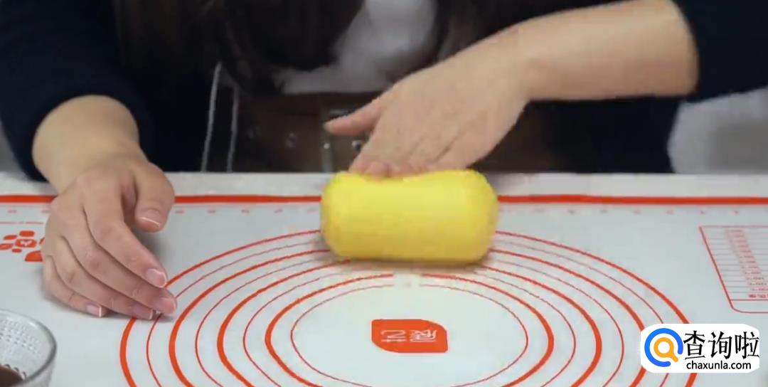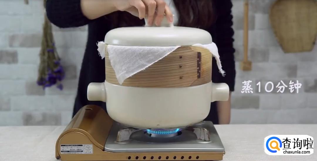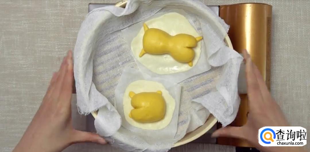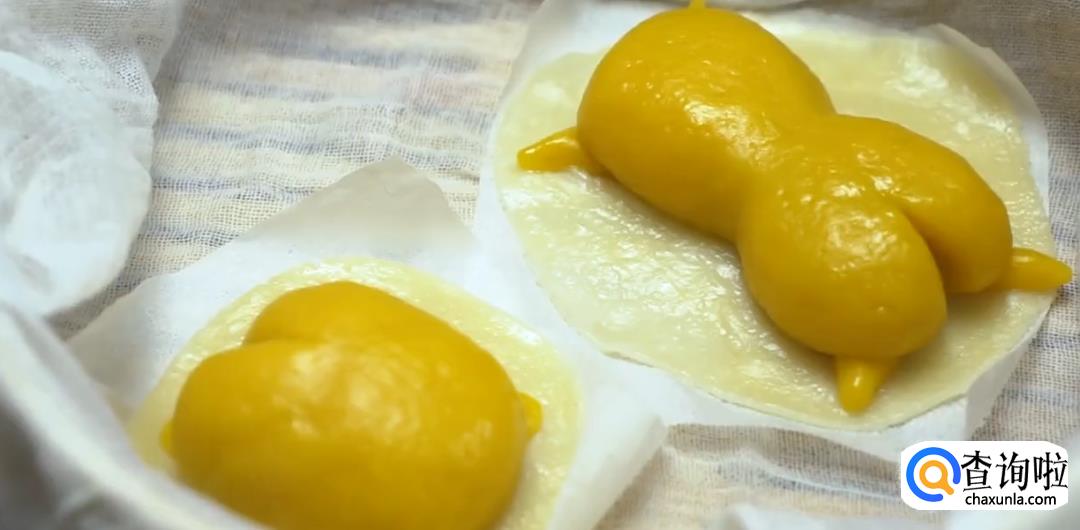 将牛奶糯米团压扁成垫子,放上懒蛋蛋,铺在烘焙纸上,上蒸笼大火蒸10分钟。