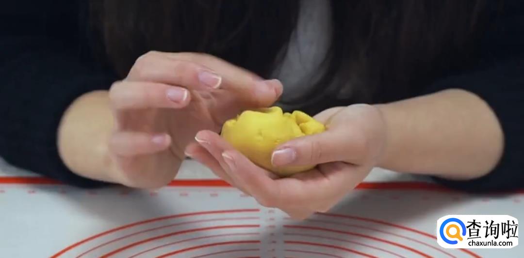 将南瓜糯米团揉搓几下,切一块下来包入巧克力馅,然后收紧口子捏成团状。