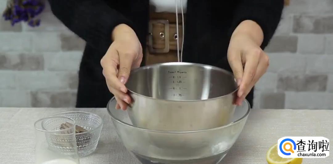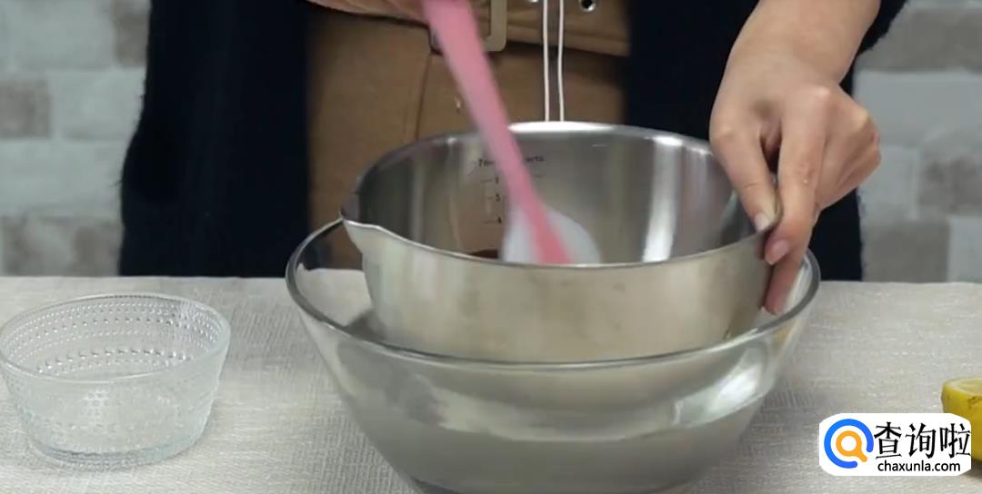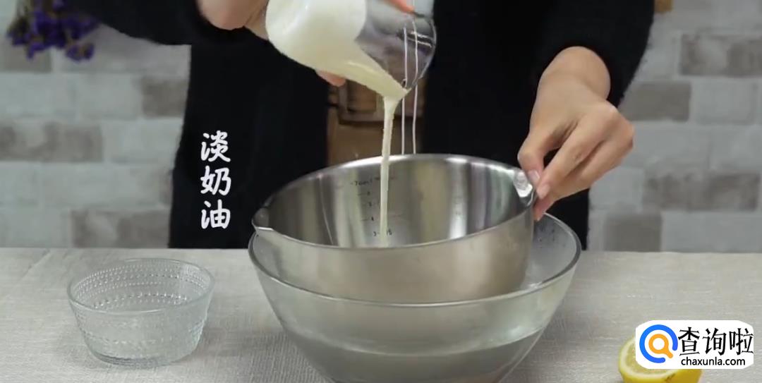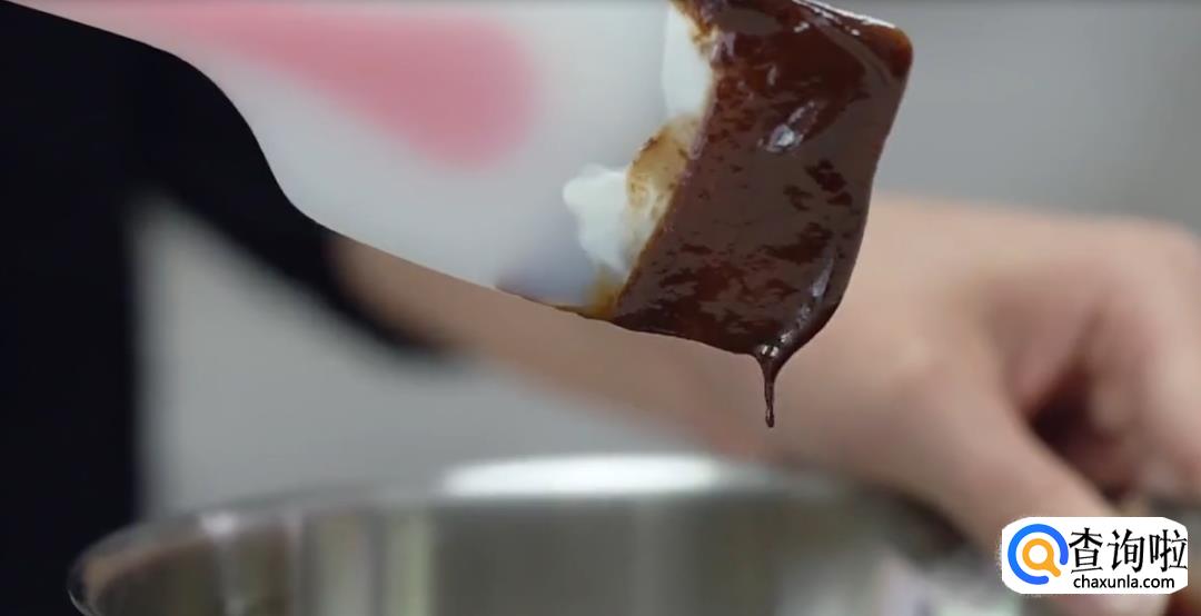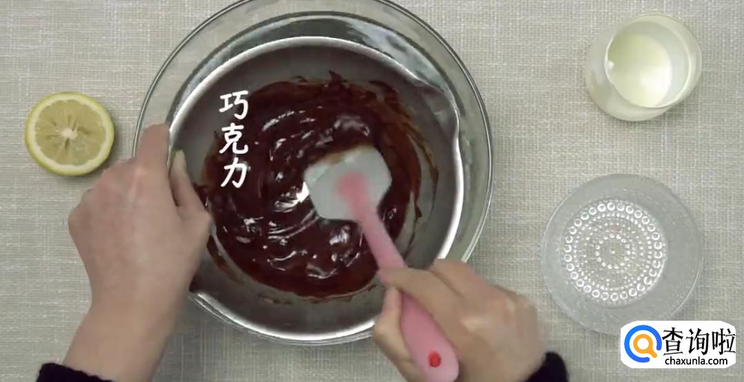 在巧克力中倒入淡奶油,柠檬汁搅拌均匀成糊状。