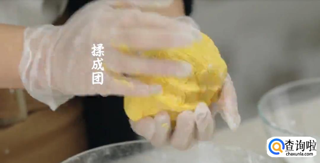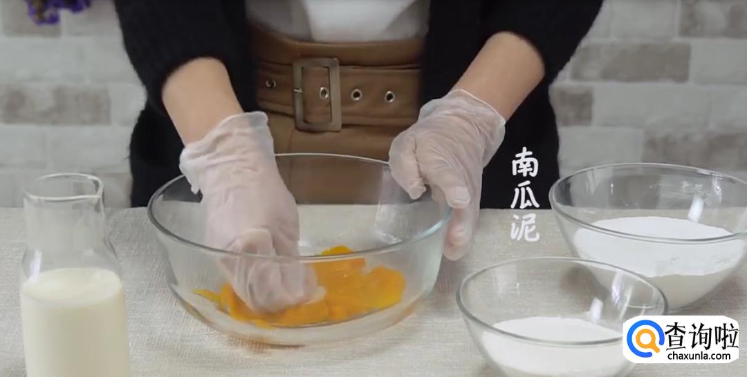 将蒸熟的南瓜压成泥状,倒入200g糯米粉,100g面粉然后揉搓均匀成团状。