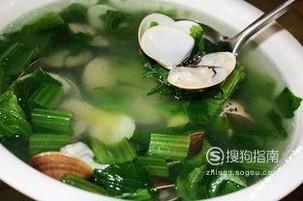 车螺芥菜汤。车螺味鲜,芥菜性凉,这也是夏天饭桌上常见的一道汤。车螺不用太多,不然都是螺味,芥菜的味道就被夺走了。