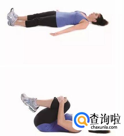 2.弯曲双腿,双手抱膝,慢慢拉向胸部,让下背部感到拉伸,坚持30秒。