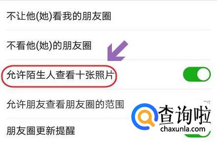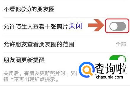 我们往下拉动页面,找到其中的“允许陌生人查看十张照片”这一项,我们看到系统默认是开启状态的,我们只需将右侧的开关关闭即可;