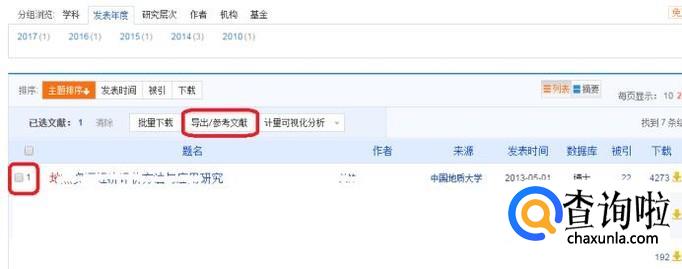就能返回该论文的作者、发表期刊、发表时间等齐全资料,我们勾选该论文,点击图中“导出/参考文献”按钮。