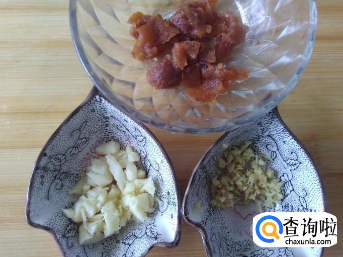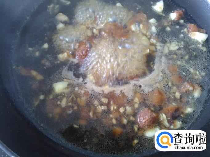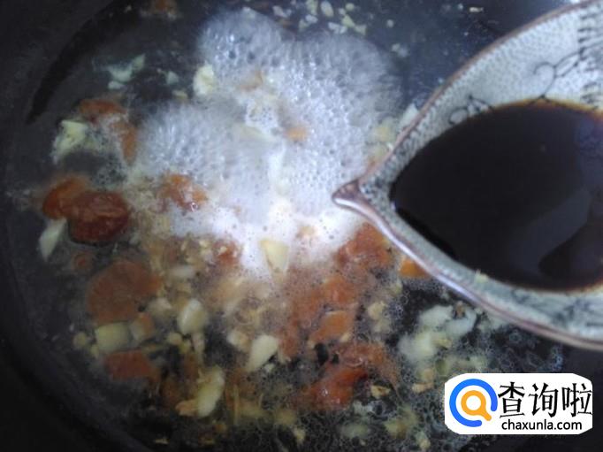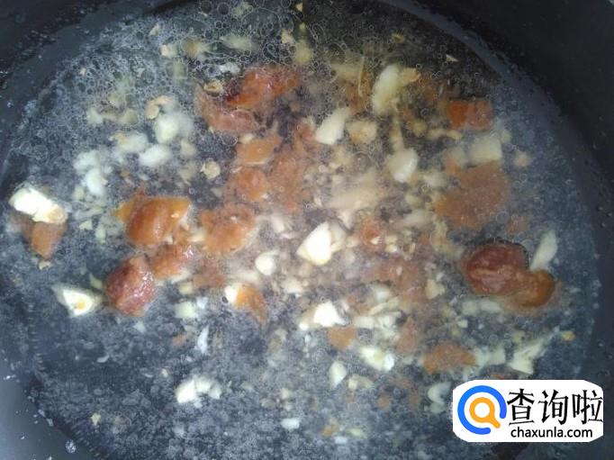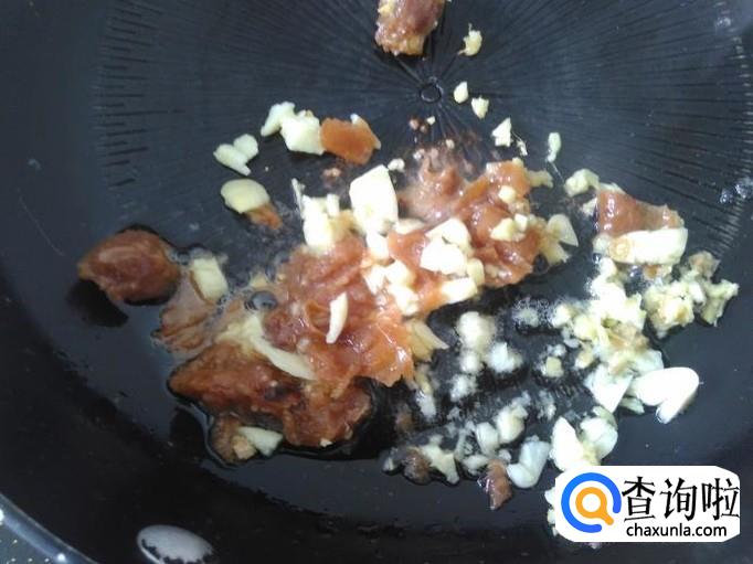 热锅起油,放蒜米、姜蓉、酸梅进去加少量盐花翻炒一下。