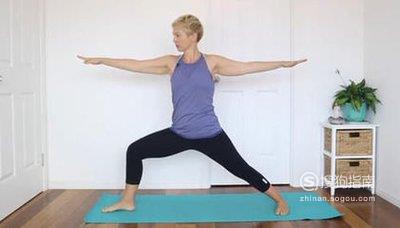 左脚屈膝90°,右脚向后一步,且脚伸直,后脚跟抬起,双手向两侧打开,保持5次呼吸,换边。