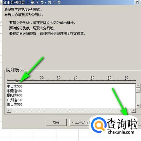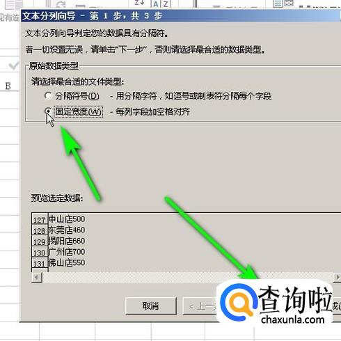 调出了分列向导面板,当前是向导的第一步,点选:固定宽度;再点:下一步