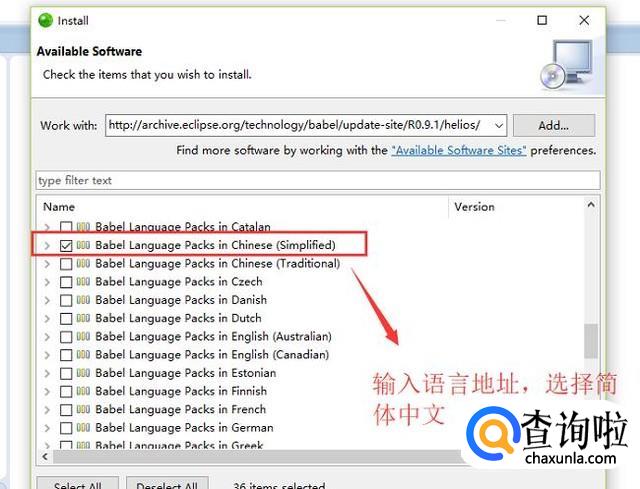 接下来会弹出Install界面,我们需要在输入框中输入语言库的地址,然后在下面选项简体中文版本,如下图所示