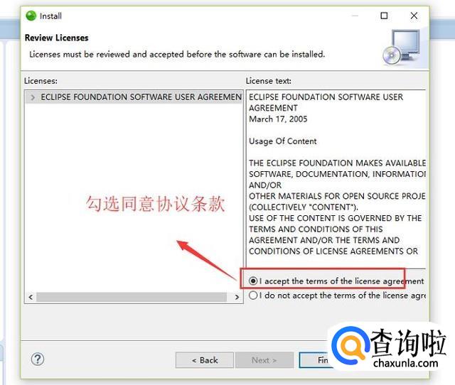 然后会进入Review Licenses界面,我们需要点击同意协议条款选项并点击Finish按钮,如下图所示