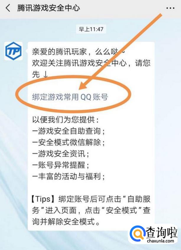 公众号关注之后进入它的主页面,这时系统会发来一条推送,我们点击推送中的“绑定游戏常用QQ账号”按键。