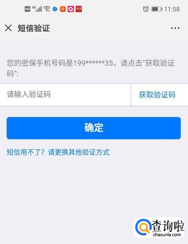 如果输入的QQ账号绑定了密保手机,这时就会出现“短信验证”的步骤,在“短信验证”页面我们输入密保手机收到的验证码,然后点击“确定”。