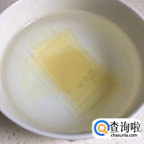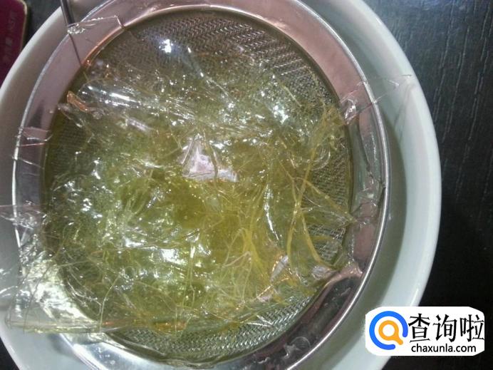 吉利丁片完全软化后,捞出滤水。软化时间不宜过长,一般5-10分钟。