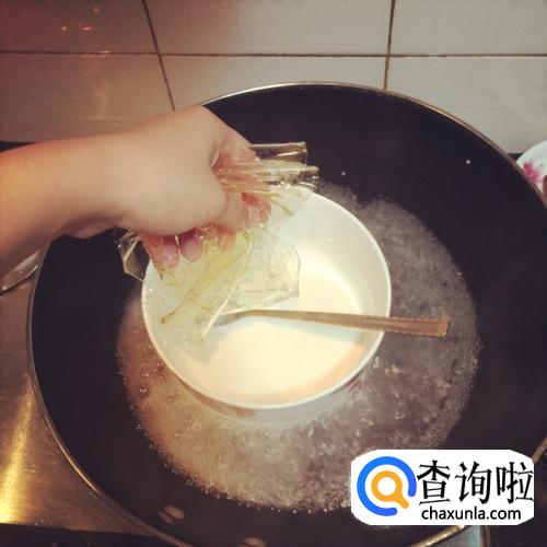 进行隔水加热,将软化后的吉利丁片融化至液体。加热时温度不宜过高,不然会使吉利丁片失去凝聚力