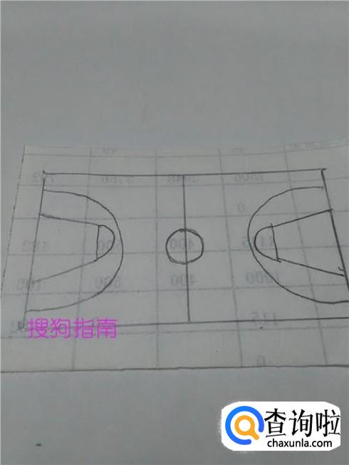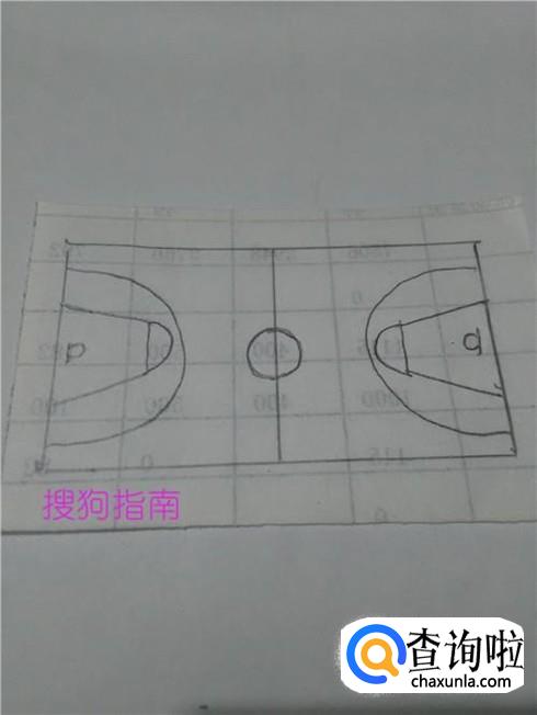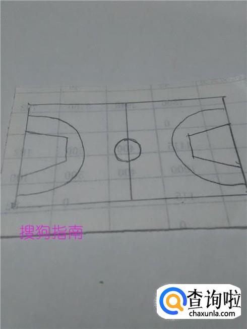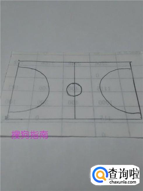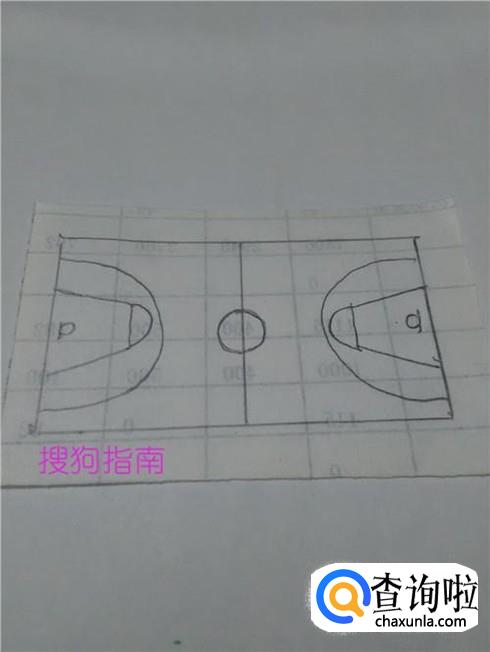 在梯形里边各画一条短的竖线和一个小圆圈,表示篮板和篮筐,篮球场地就画完了。