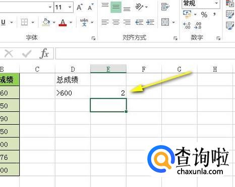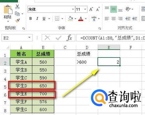 按下回车键,得到结果:2;那么,就统计出大于600的人数为2人。
