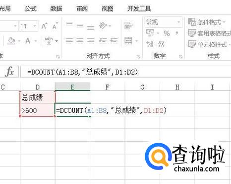 公式解释:DCOUNT(A1:B8,"总成绩",D1:D2)中的DCOUNT我们可以理解为统计单元格个数的函数。括号内分为三段;左边这一段是是表格数据区域;中间这一段是要统计的列的字段号(可以理解为是这一列数据的名称);右边这一段是条件区域。