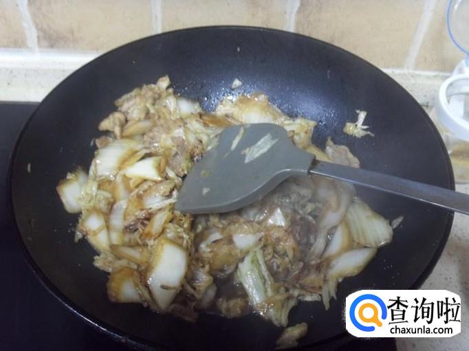 接着将切成条状的白菜放进锅中,进行翻炒,加入盐等调料调味。