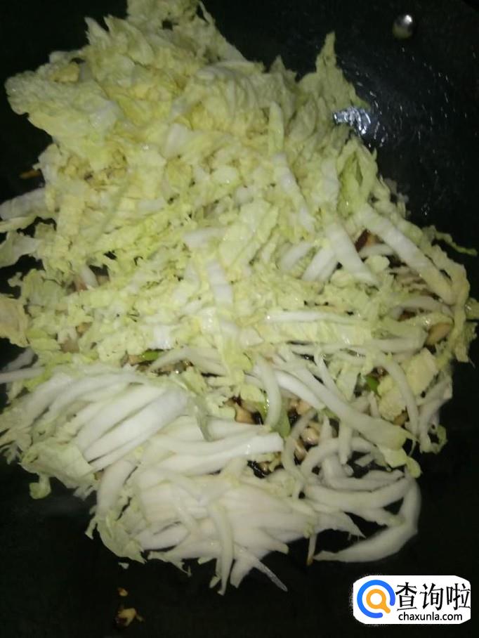 将娃娃菜下入锅里,翻炒几下,翻炒至叶子的部分变软;