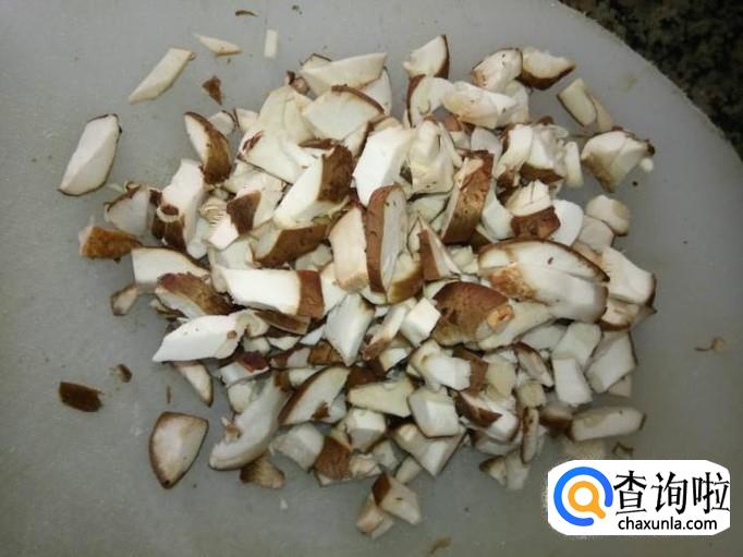 鲜香菇切成碎块会变得好像很多,小编这次切了三四个鲜香菇,足矣;