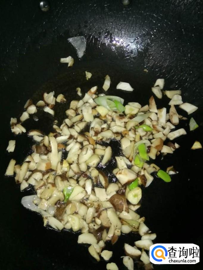 将香菇碎块下入锅里一起翻炒,一直翻炒至香菇变软、出香味为止;