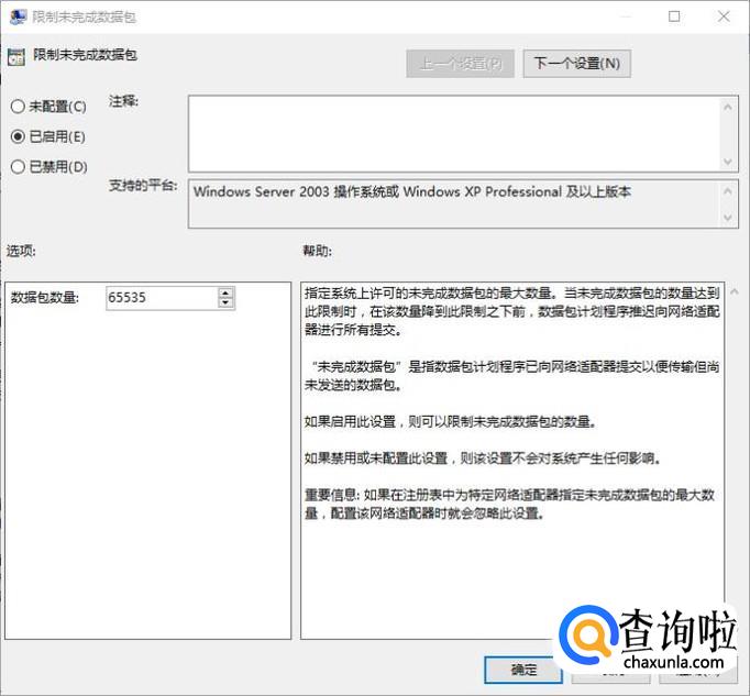 在此窗口的右窗格中,查找名为“限制未完成数据包”的设置,默认情况下必须显示“否”状态。双击相同的设置进行修改:点启用