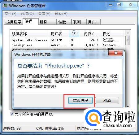 弹出对话框,提示你是否继续,确定继续就点击【结束进程】。