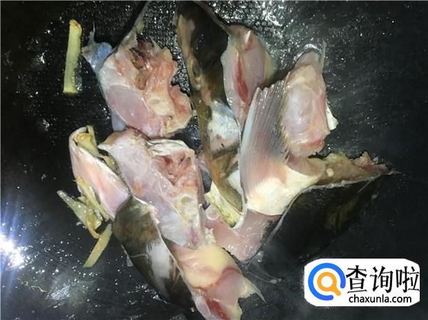 然后再把鱼头倒入锅中,翻炒鱼头。把鱼头翻炒5分钟左右,再倒入适量的凉开水,大火煮。