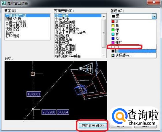 如图所示,出现“图形窗口颜色”面板,我们把颜色由原来的黑色,更改一下就可以了,比如我改成白色,点击“应用并关闭”。