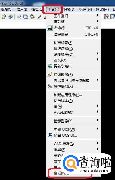 首先,我们打开CAD,如图所示,此时背景是黑色,我们点击“工具”,“选项”。