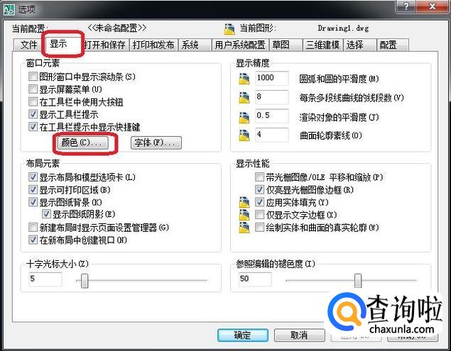 出现“选项”面板,我们点击“显示”标签,点击面板中间的“颜色”按钮。